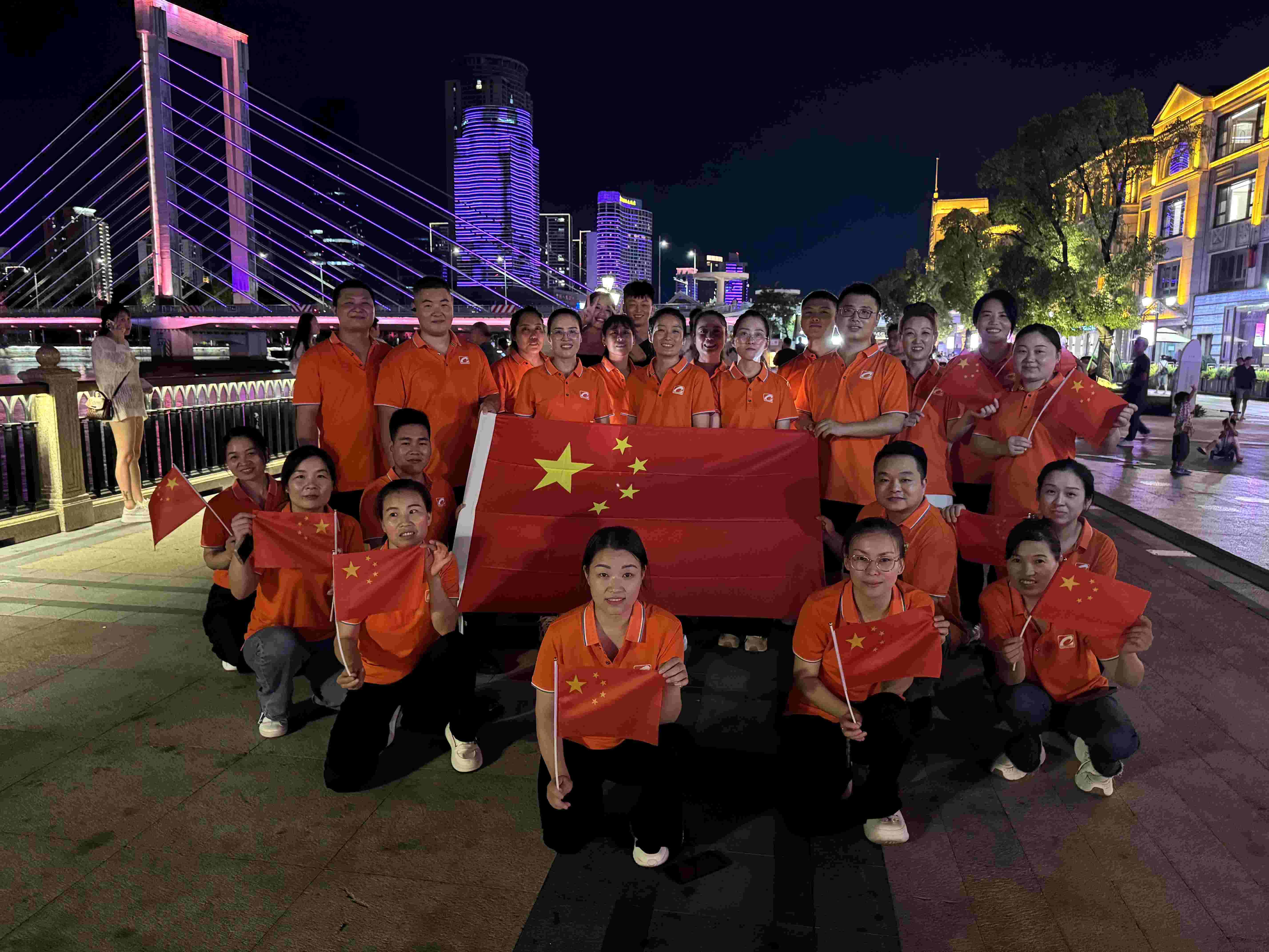 夜幕下的宁波老外滩,康赛妮人身着橙衫,手持国旗,环绕合影。同衫、同梦、同心,以赤诚致敬祖国。璀璨灯火中,企业担当与爱国情怀相融,定格热血奋进的动人图景。