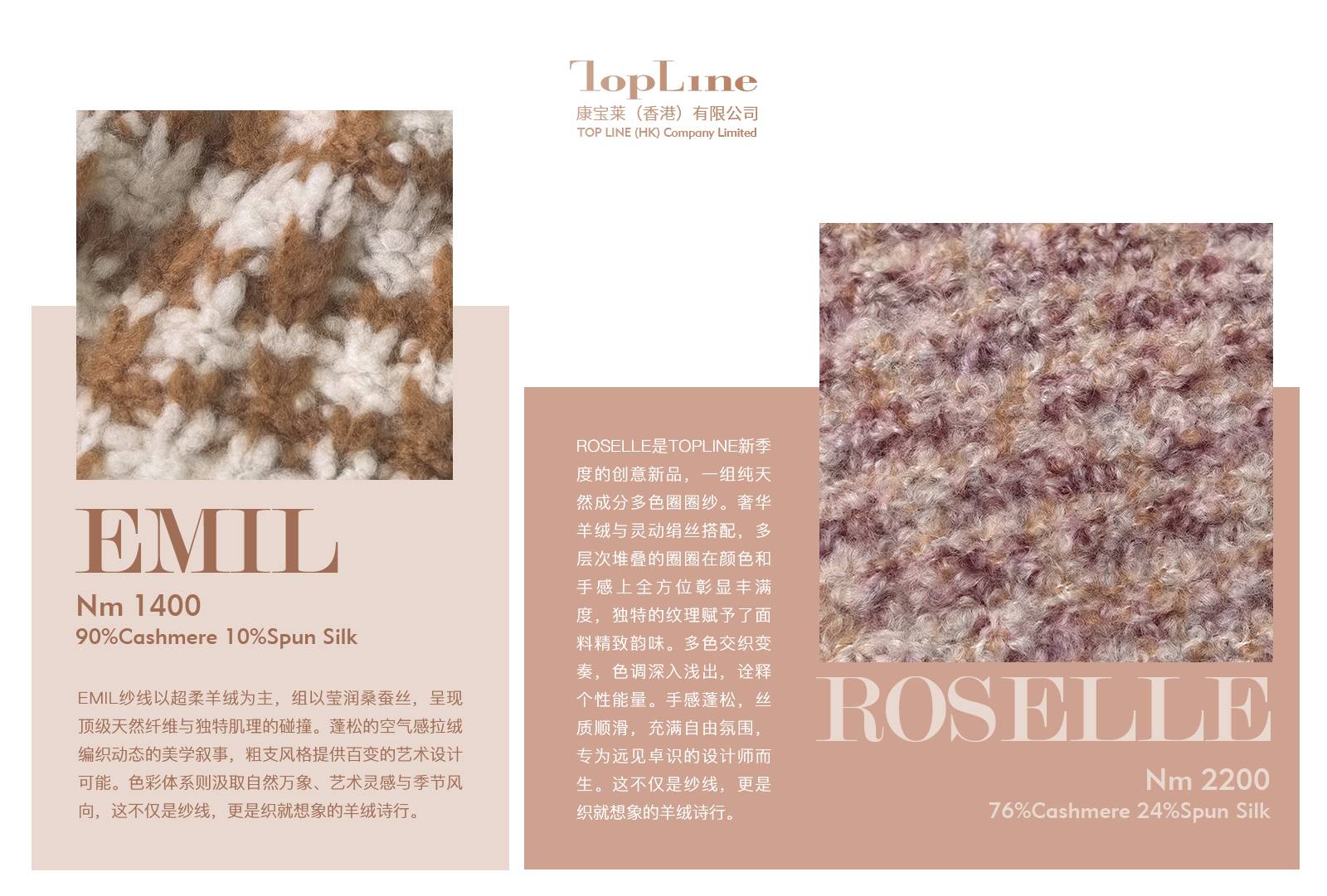 康赛妮集团旗下花式纱线品牌TOPLINE携新季度创意力作——ROSELLE,开启中国首展,新品央视直播敬请关注!质感王牌——EMIL超柔混纺纱再度登场,粗支风格适配百变设计场景。更多产品信息,期待您莅临,与我们一同织就时尚想象的羊绒诗行!