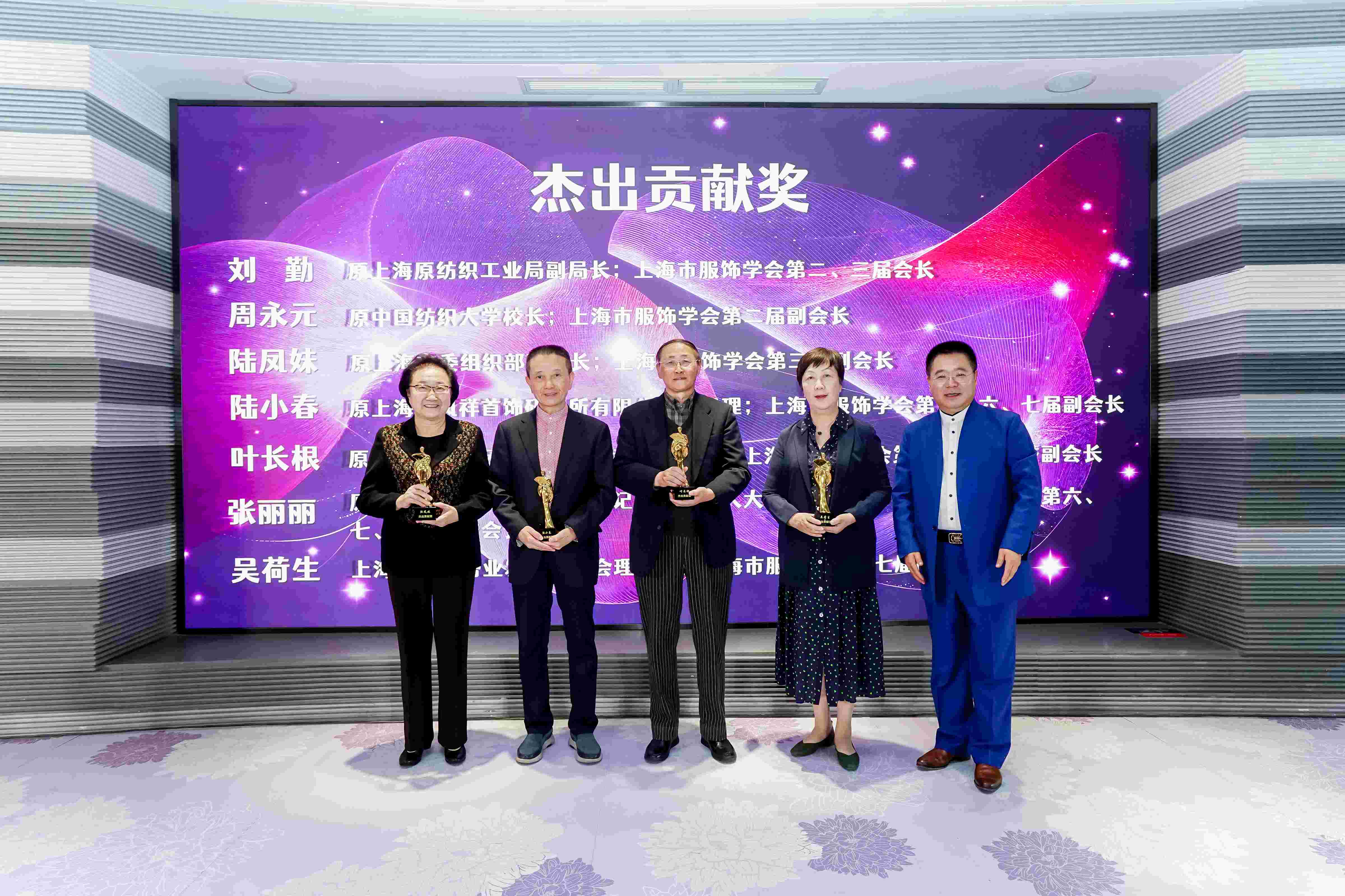在颁奖环节中,薛董与刘会长一同为推动海派时尚事业的先行者颁发荣誉,授予谭茀芸主席终身荣誉会长,陆凤妹会长、陆小春会长、叶长根会长、吴荷生会长杰出贡献奖,王传铭秘书长、宓忆琴秘书长特别贡献奖,向行业前辈致敬,传递产业传承精神。