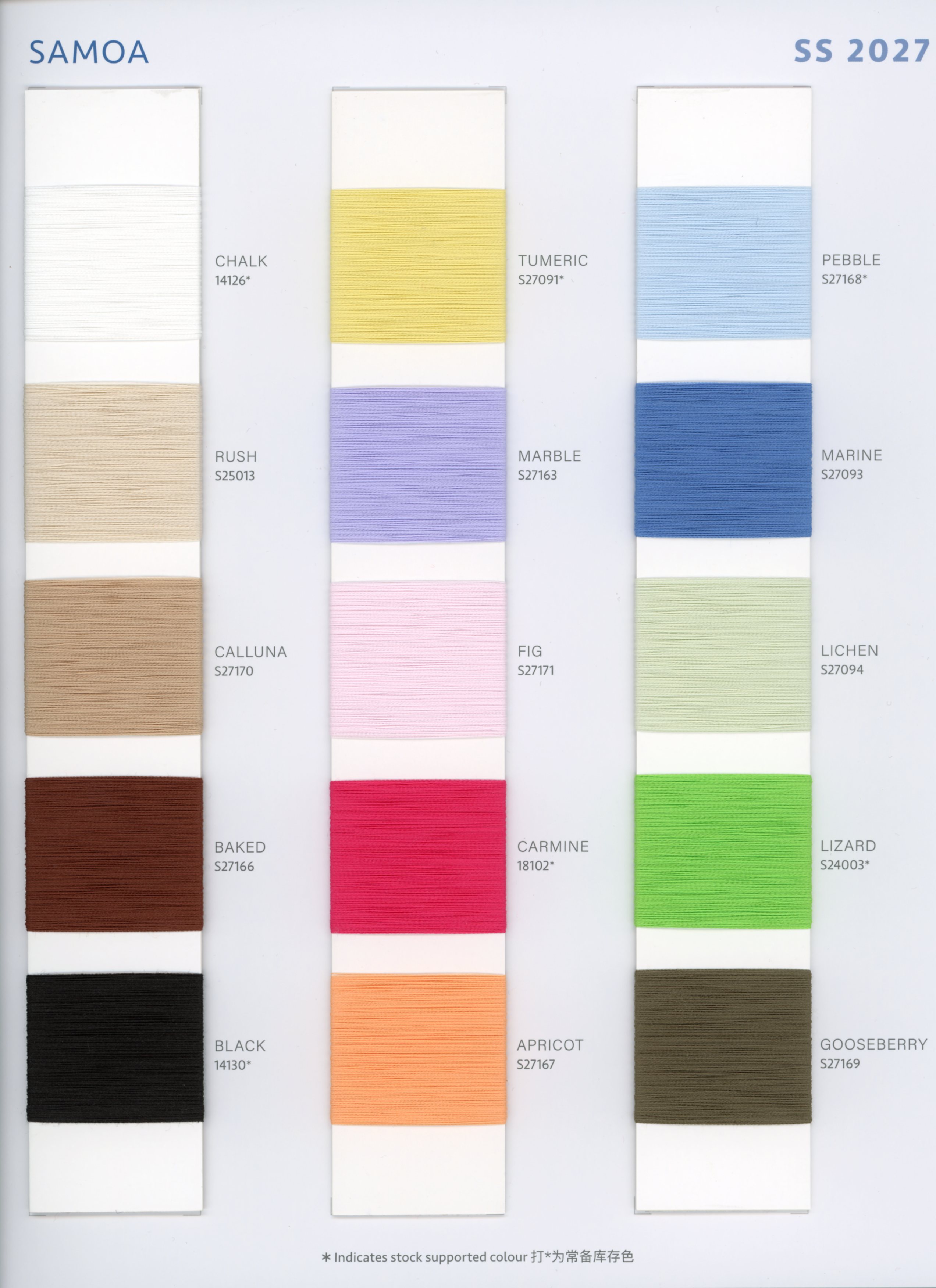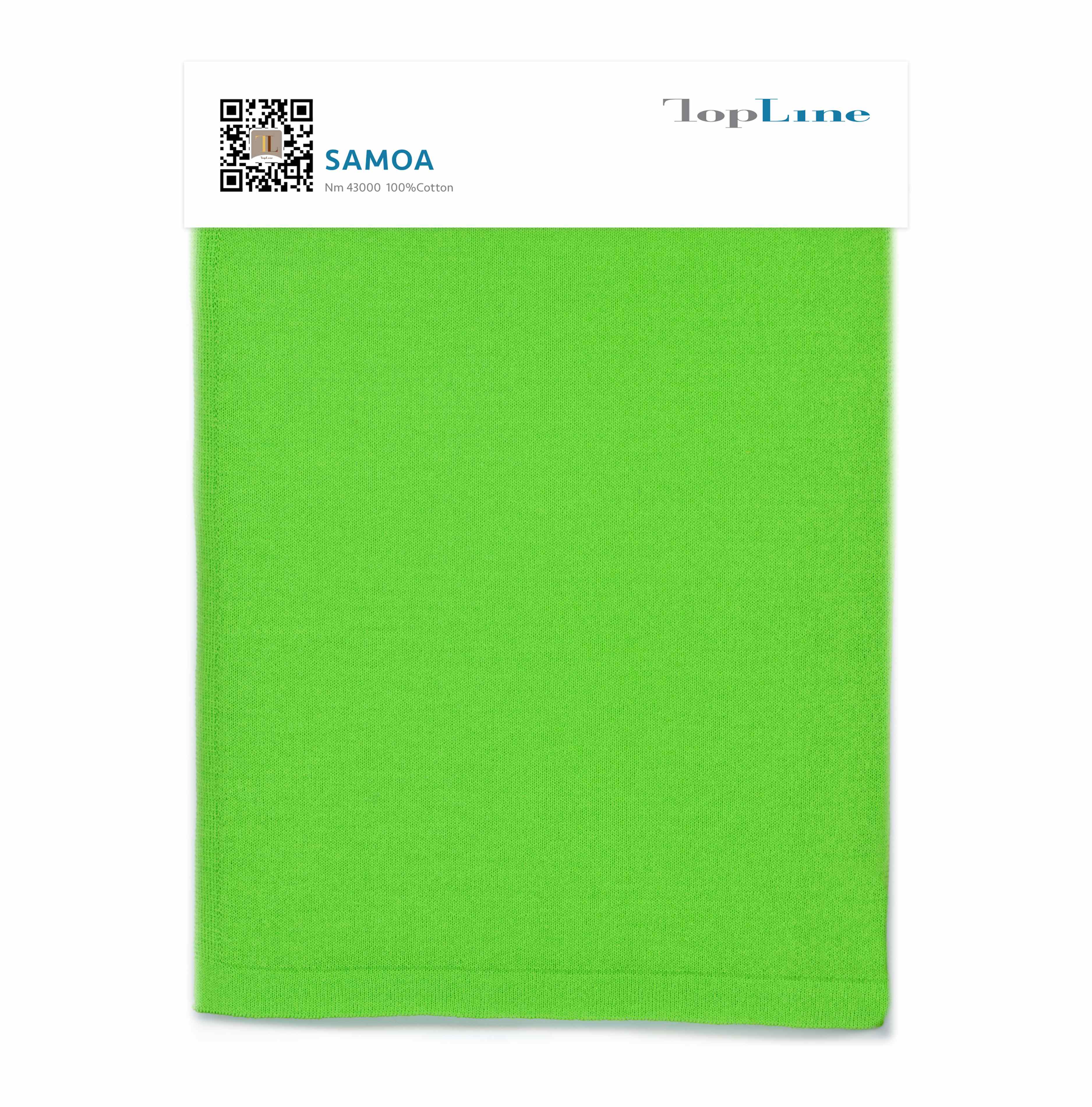纱线名称:SAMOA 纱线成分:NM43 100%埃及棉 纱线类型:强捻纱 适用针型:16/18针 最小起订量:库存色1KG起订,指定色100KG起订,可做5KG绞纱染色 库存颜色:6色库存色 色彩搭配:素色 纱线风格:纱线光洁平整,手感滑爽细腻。 适合产品:洁净、细腻的布面效果特备适合制作高档T恤。 注意事项:使用时如遇到接头,要两边各拉掉2m左右,防止织片出现松紧捻现象。